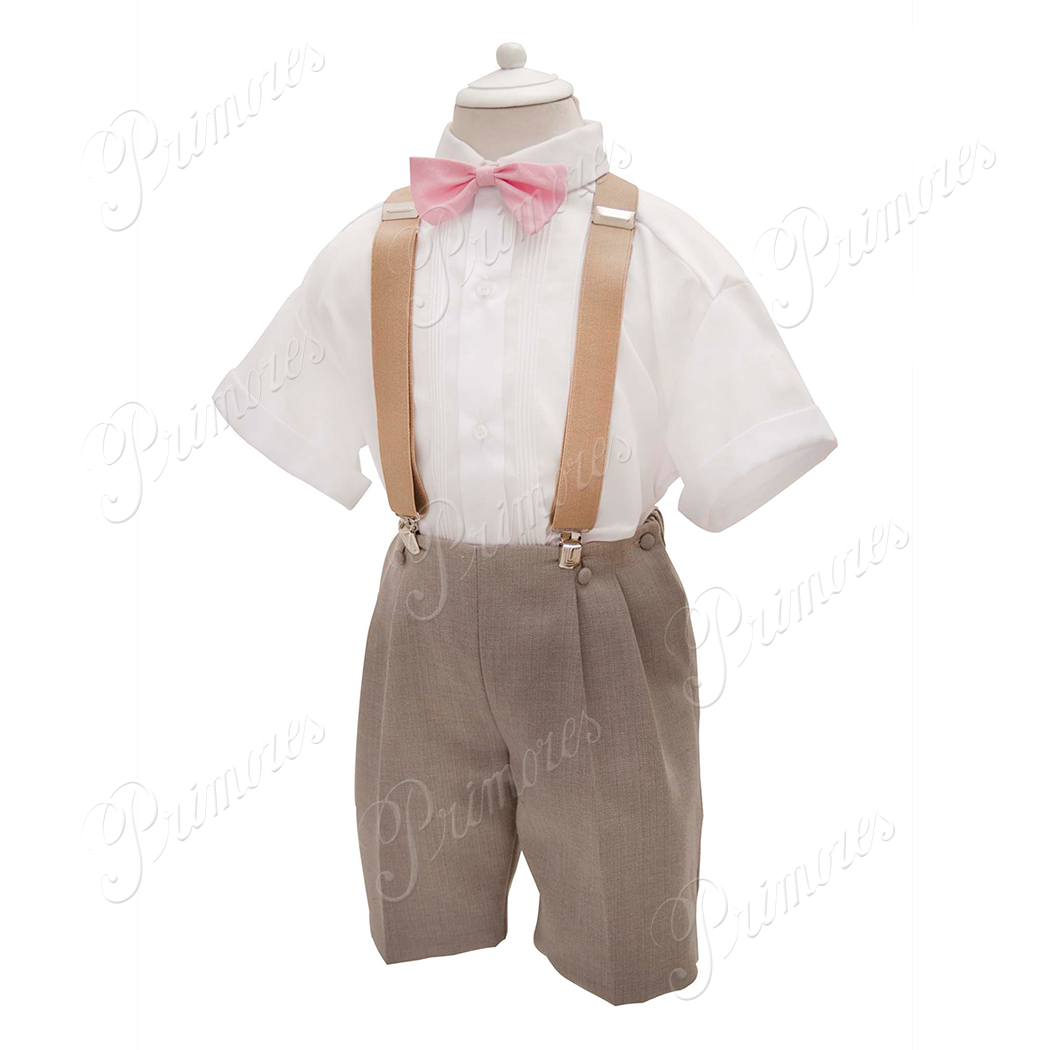 Trajecito de 4 piezas con camisa de algodón, bermuda de tergal, tirantes y corbatin