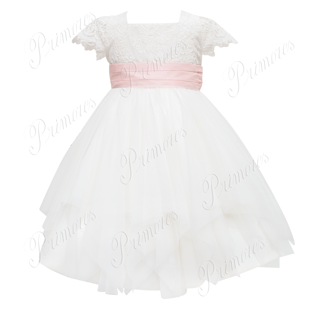 Vestido con peto de encaje de alancón, falda net y banda en telar