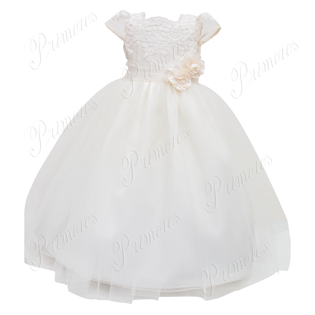 Vestido con peto en tull bordado y falda de tull francés y encajes alancón
